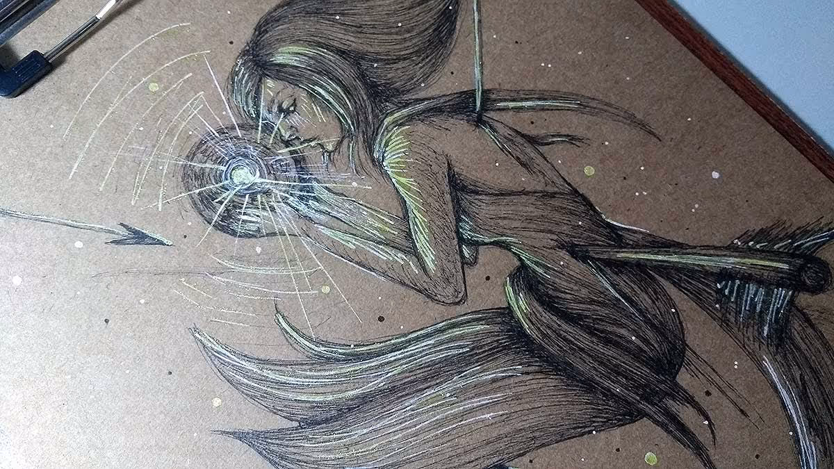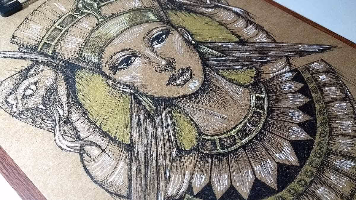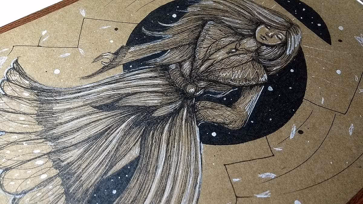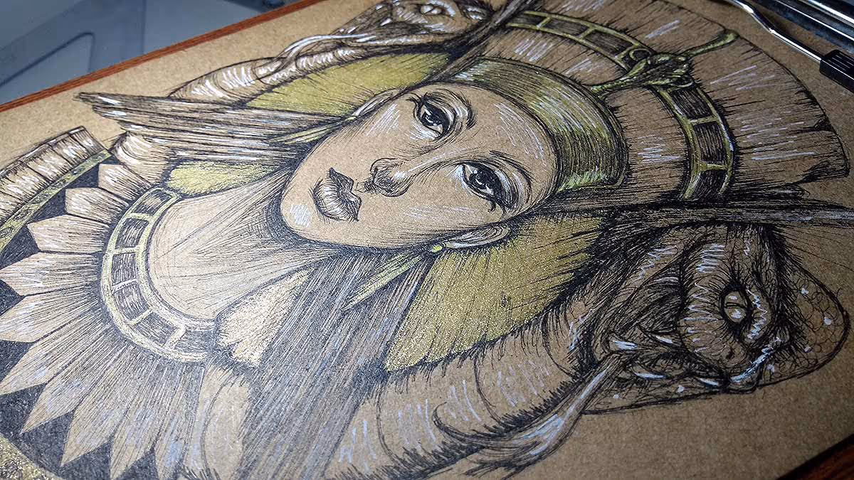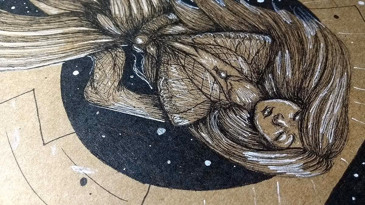 Desenho finalizado. Feito com canetas nanquim pretas, dourada e branca.