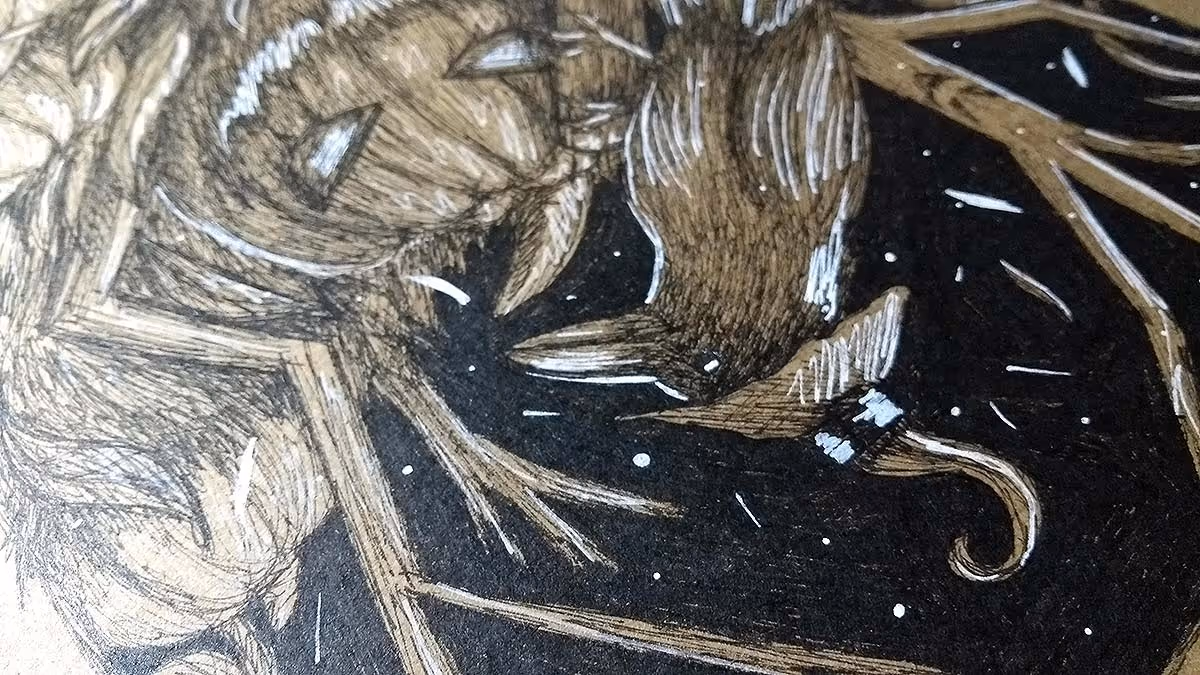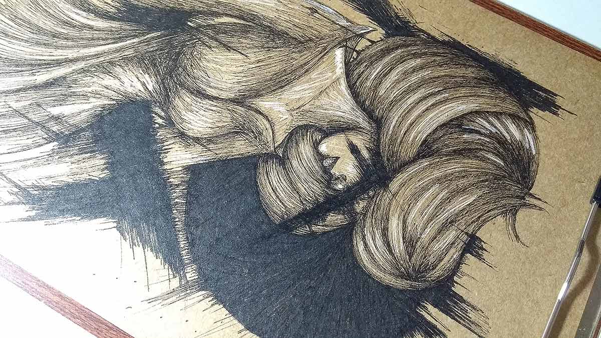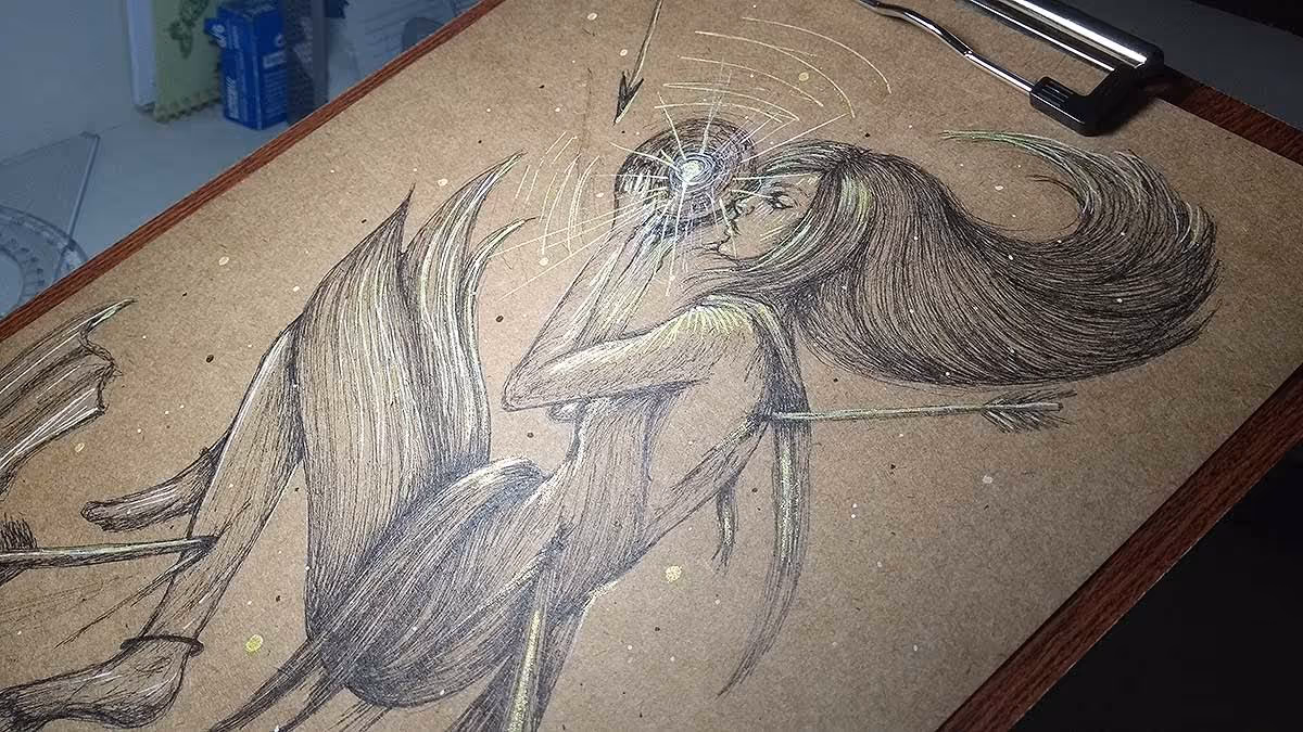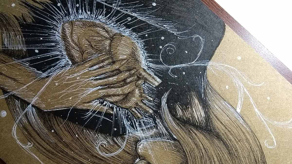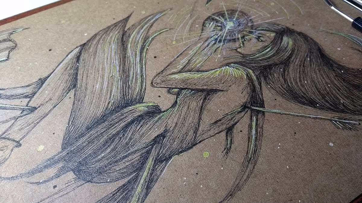 Desenho finalizado. Feito com canetas nanquim pretas, dourada e branca.