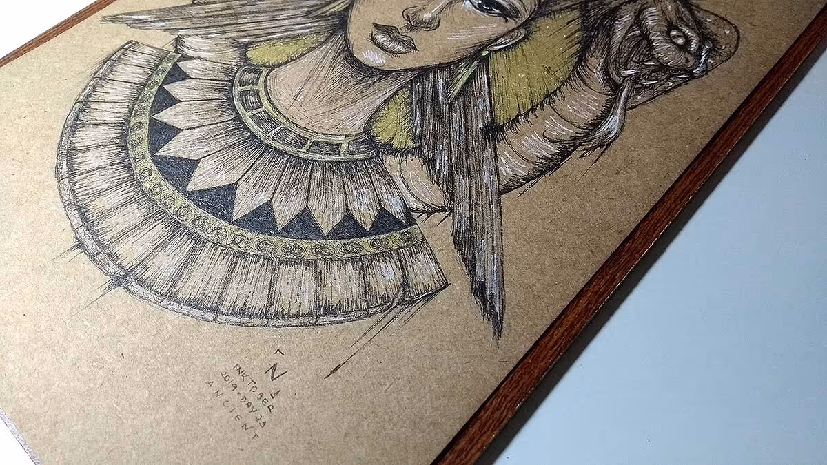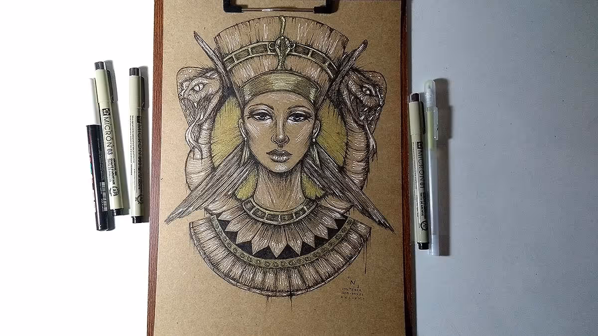 Resolvi fazer a Nefertiti — o desenho é inspirado no busto dela, além de ter um toque especial meu, haha.