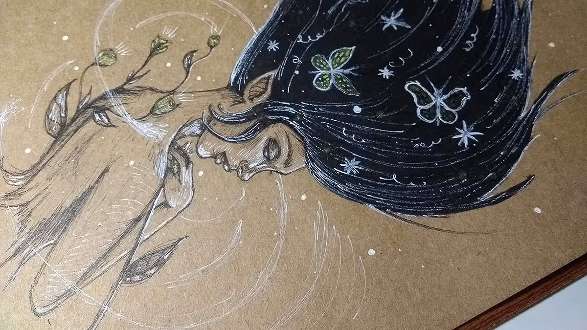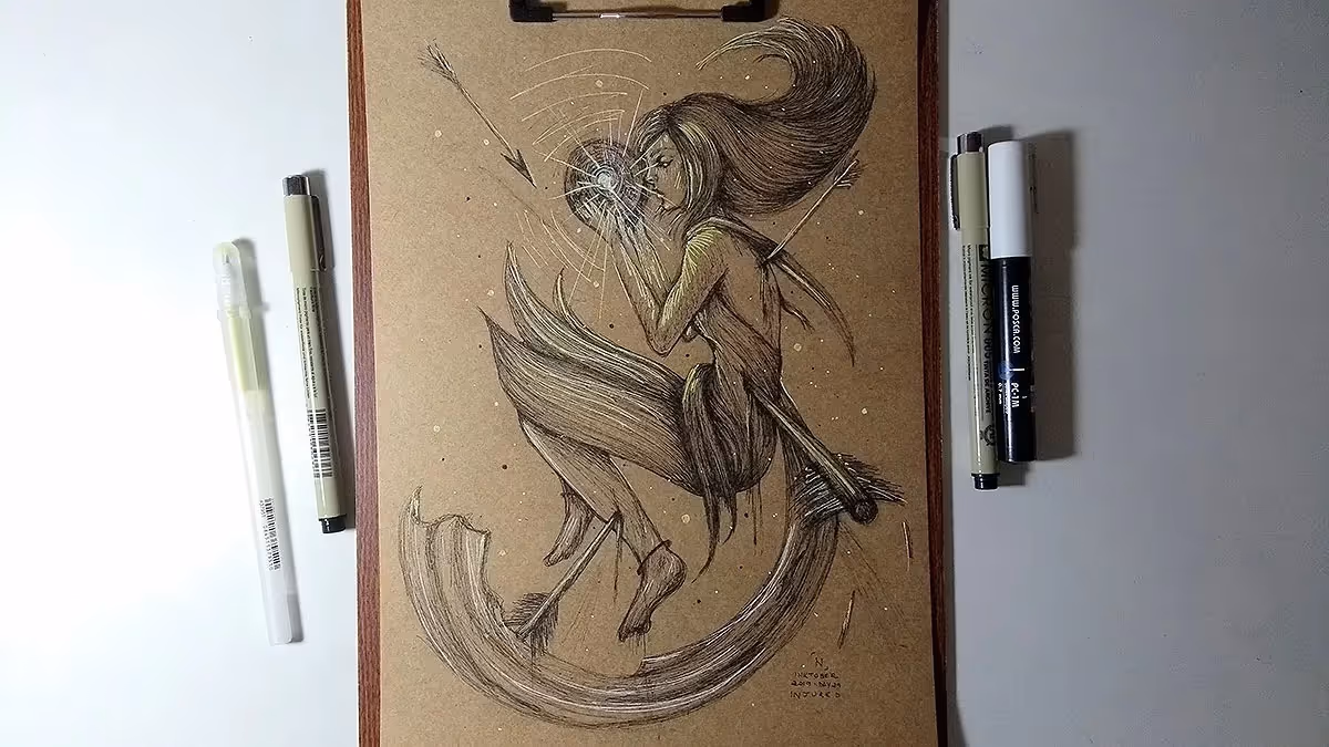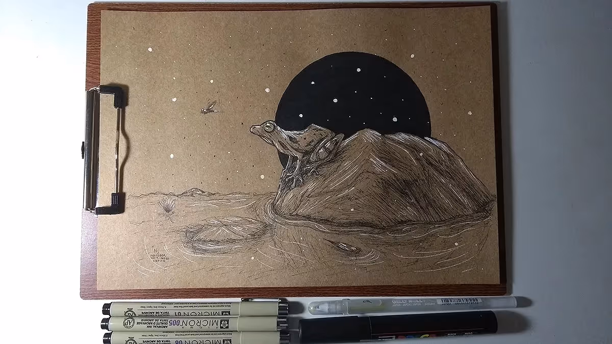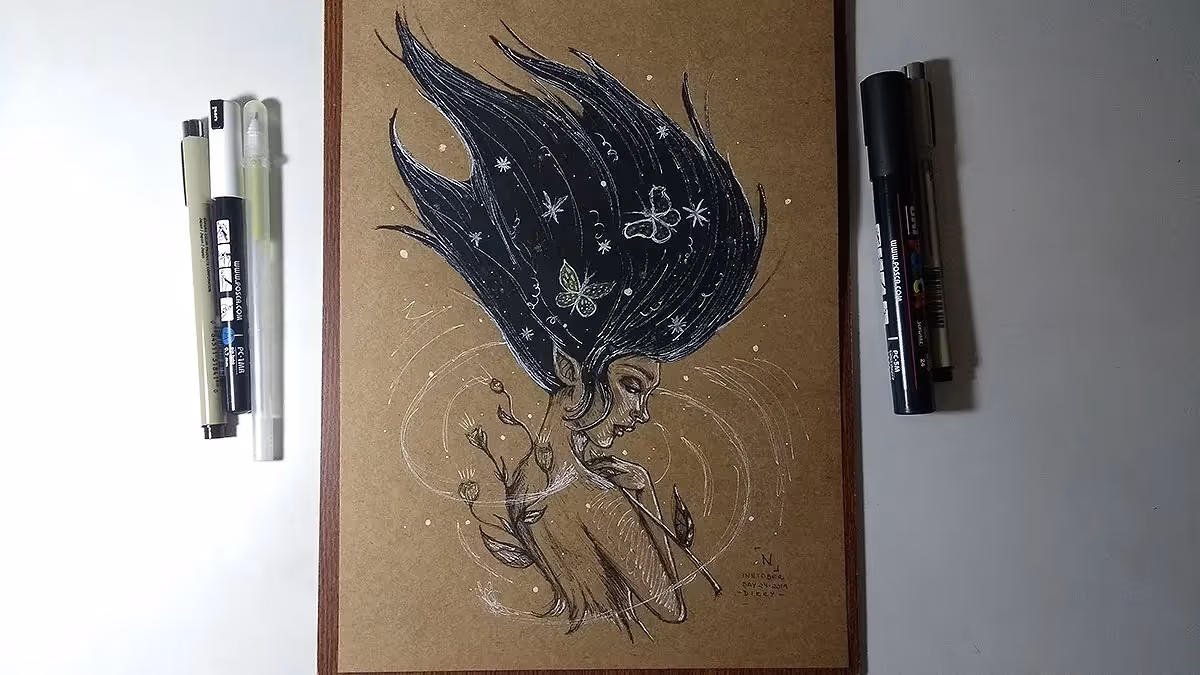 Usei canetas nanquim pretas, branca e dourada.
