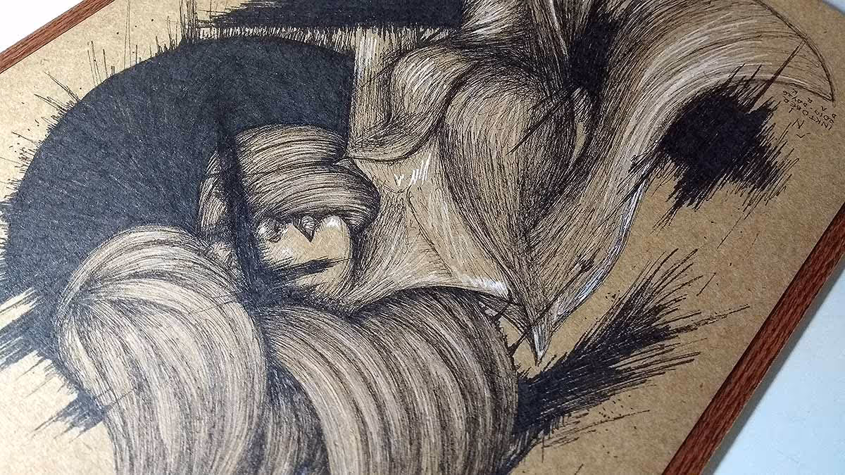 Desenho finalizado. Feito em canetas nanquim pretas e branca.
