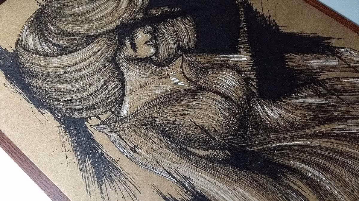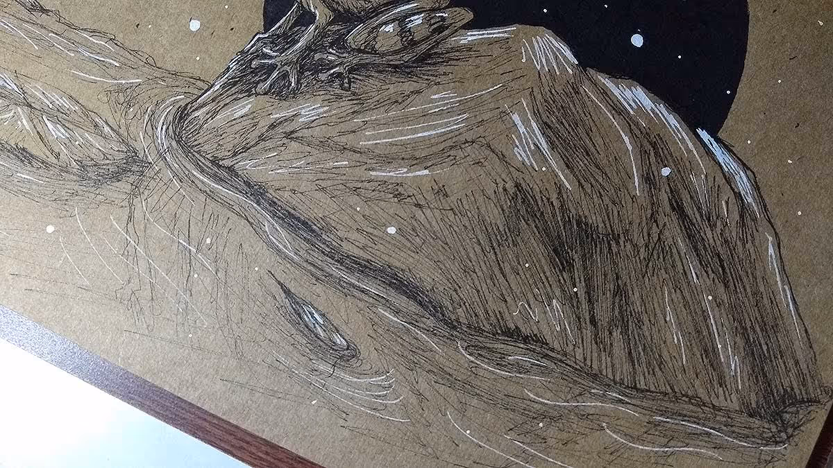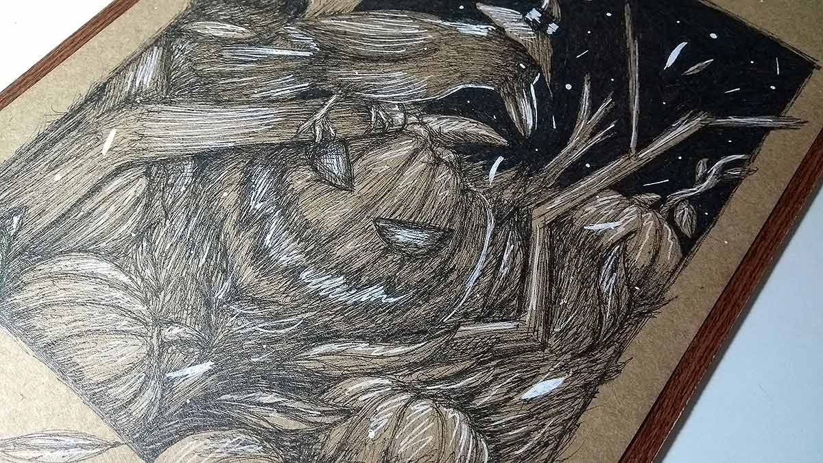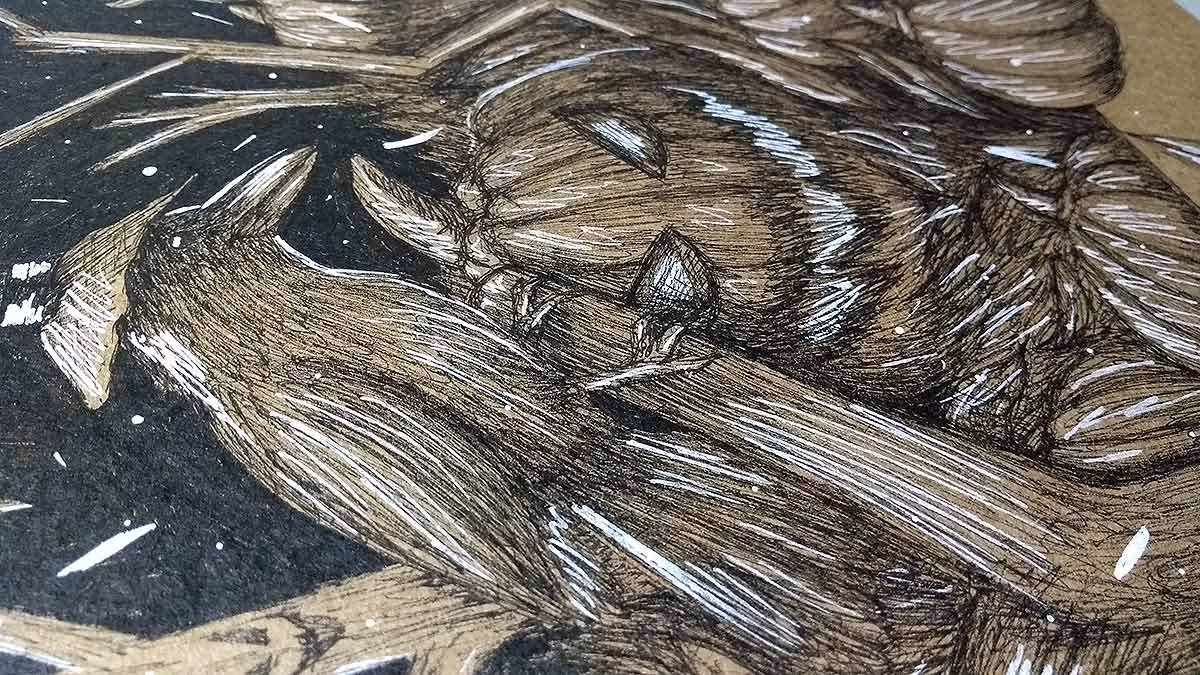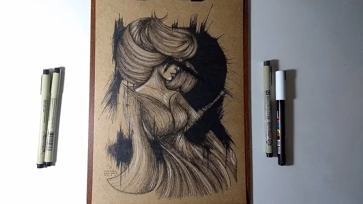 Desenho finalizado. Feito com canetas nanquim pretas e branca.