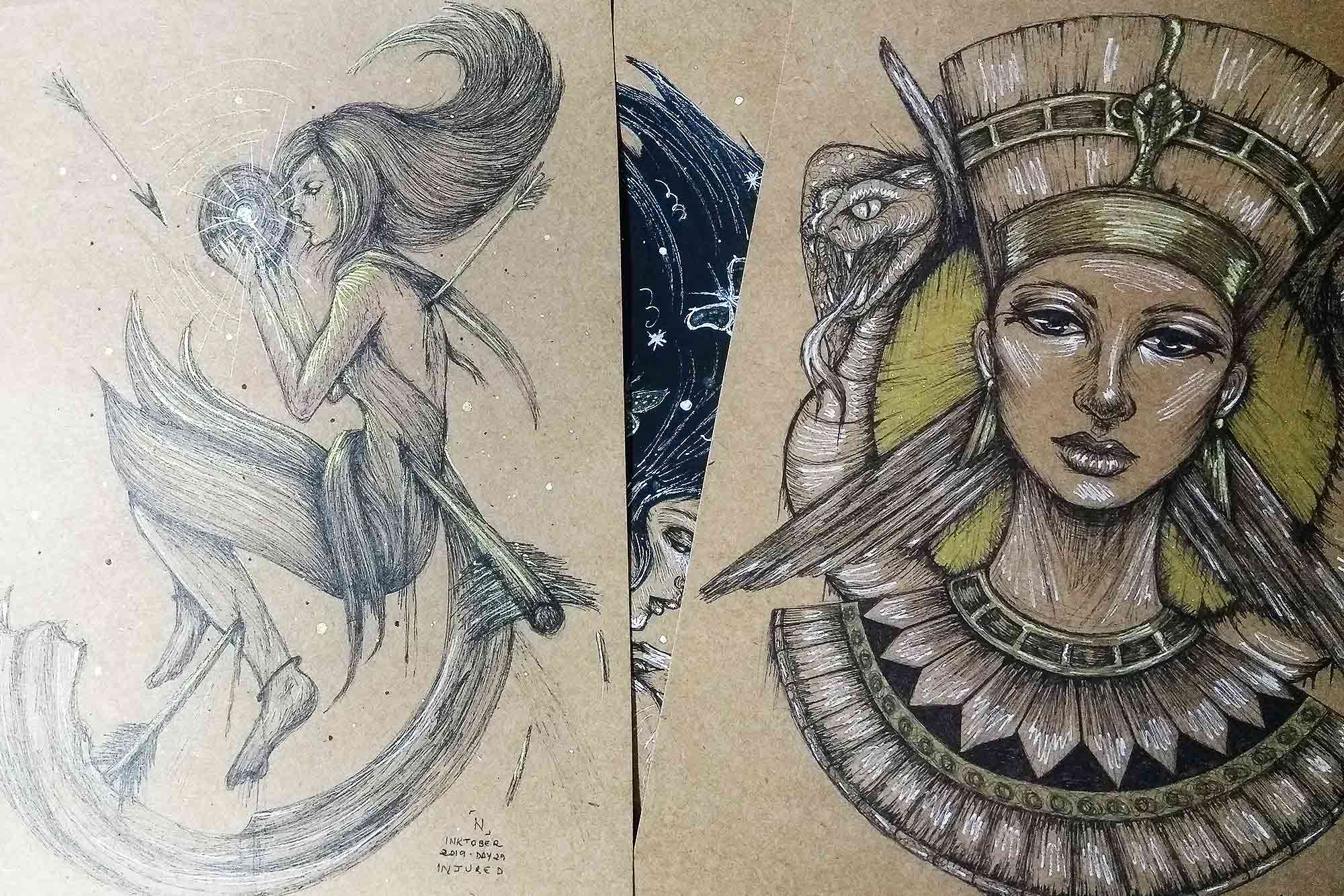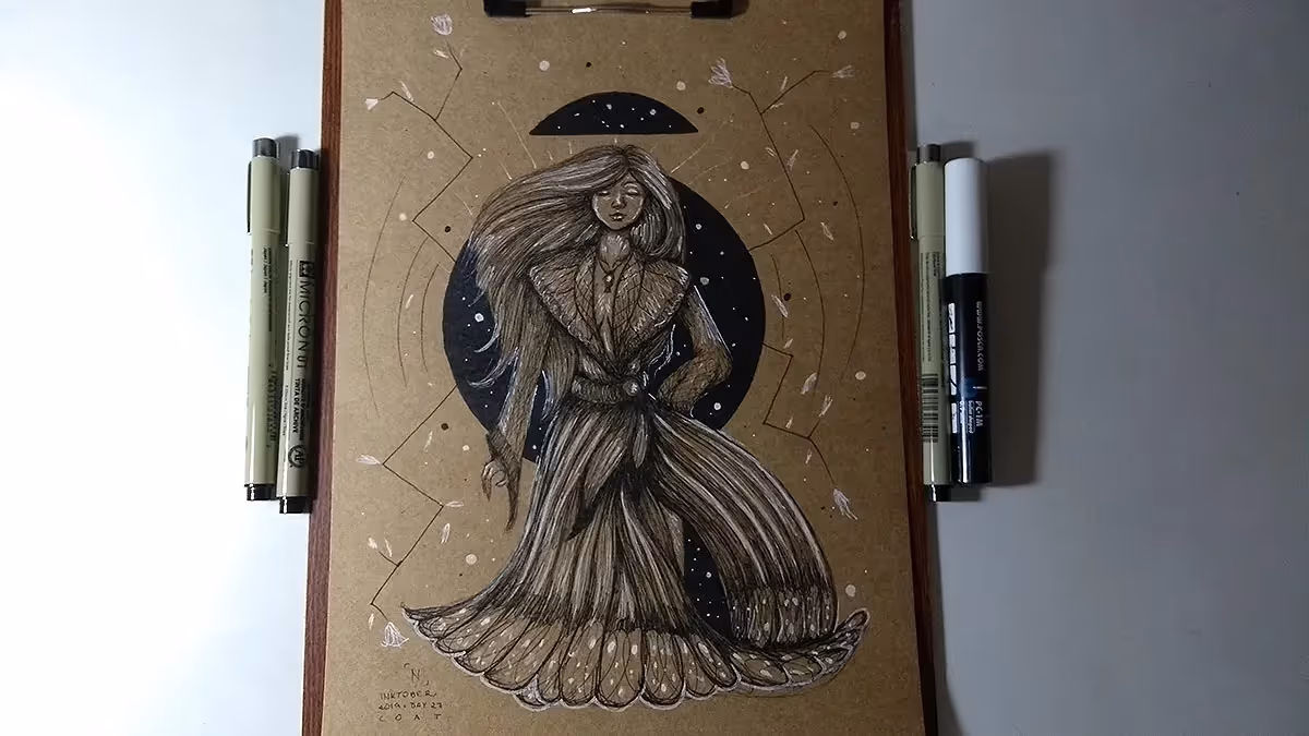 Desenho finalizado. Usei canetas nanquim pretas, branca e dourada. Um dos meus desenhos favoritos desse Inktober :)