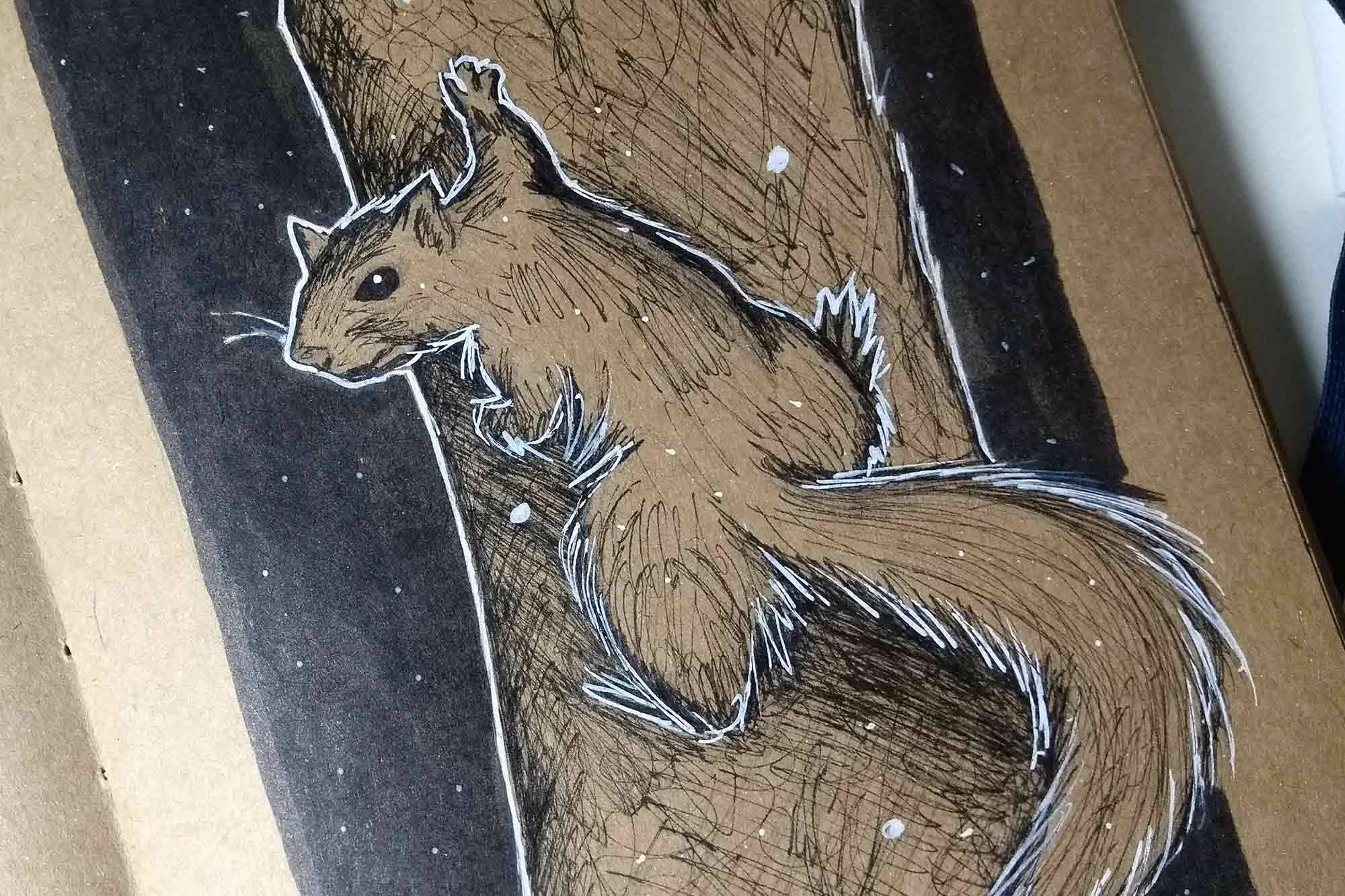 Dia 27, Climb (escalar). Um esquilo subindo uma árvore. Desenho em nanquim branco e preto também. Gosto muito de simplesmente "desenhar", sabe? Soltar a mão, criar sketches sem me preocupar se a linha está torta, ou isso ou aquilo. Pensar assim tem me ajudado muito a desenvolver meu estilo.