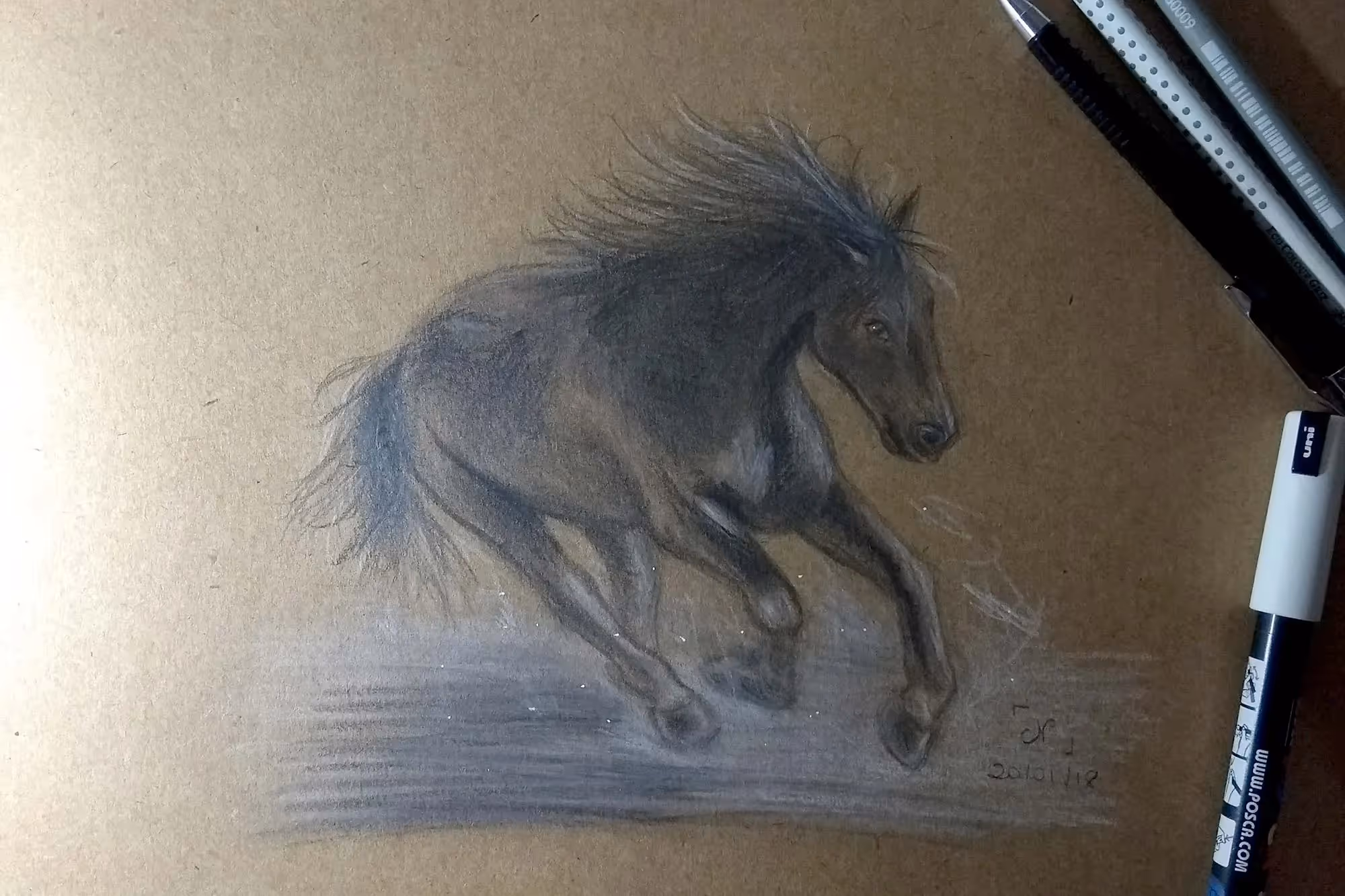 Esse foi feito com grafite, lápis branco e alguns pequenos singelos detalhes com caneta branca. Inclusive, mantive algumas áreas do cavalo sem pintar para que a própria cor do papel desse a característica de luz projetada ao desenho.