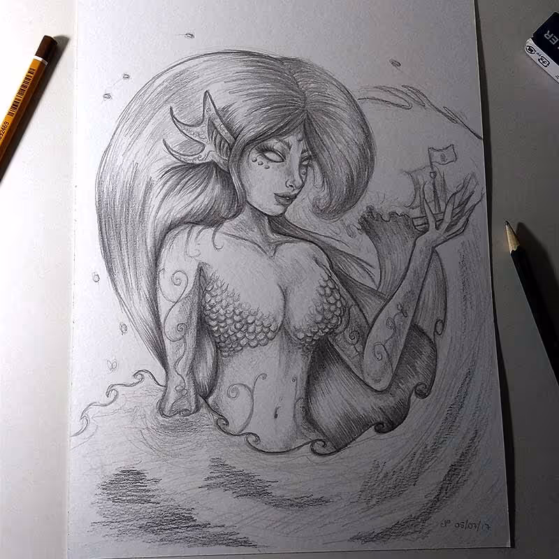 Uma visão própria da Calipso, ninfa do mar. Desenho feito à lápis sobre papel Canson A4 de 300g/m².
