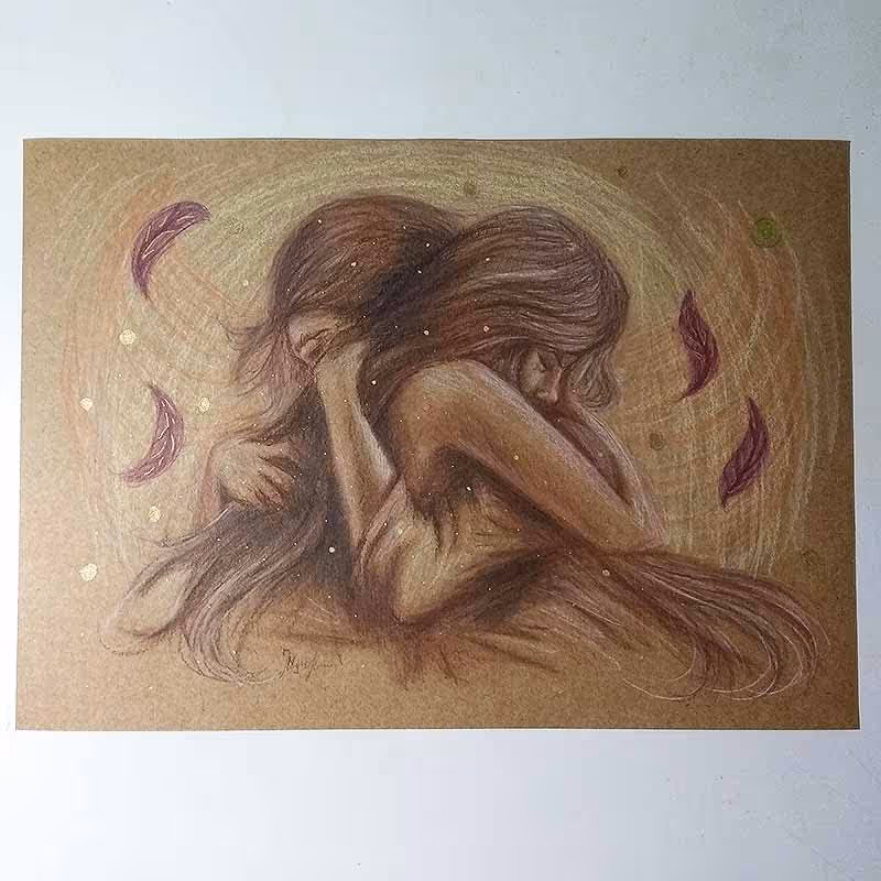 Desenho feito em lápis sépia da Koh-I-Noor, lápis pastel Polychromos e caneta dourada da UniPosca sobre papel Kraft A4.