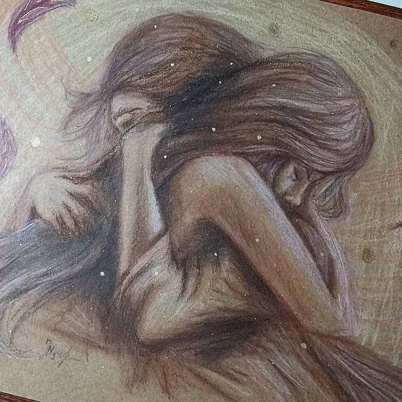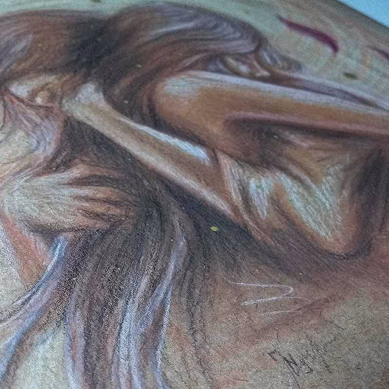Desenho feito em lápis pastel Faber-Castell Polychromos (e alguns detalhes em caneta nanquim UniPosca dourada) sobre papel Canson A4 de 300g/m².