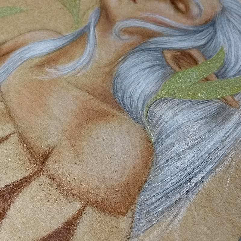 Desenho feito em lápis pastel Faber-Castell Polychromos (e alguns detalhes em caneta nanquim UniPosca dourada) sobre papel Canson A4 de 300g/m².