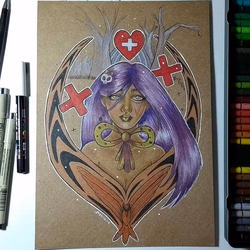 Desenho em técnica mista, feito em canetas nanquim Pigma Micron/UniPosca e lápis pastel Polychromos sobre papel Kraft A4 de 200g/m².