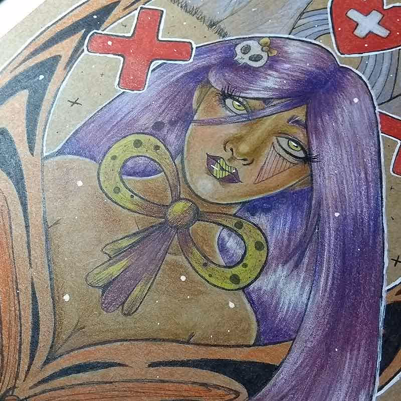 Desenho feito em lápis pastel Faber-Castell Polychromos (e alguns detalhes em caneta nanquim UniPosca dourada) sobre papel Canson A4 de 300g/m².