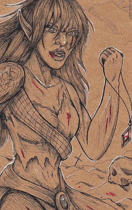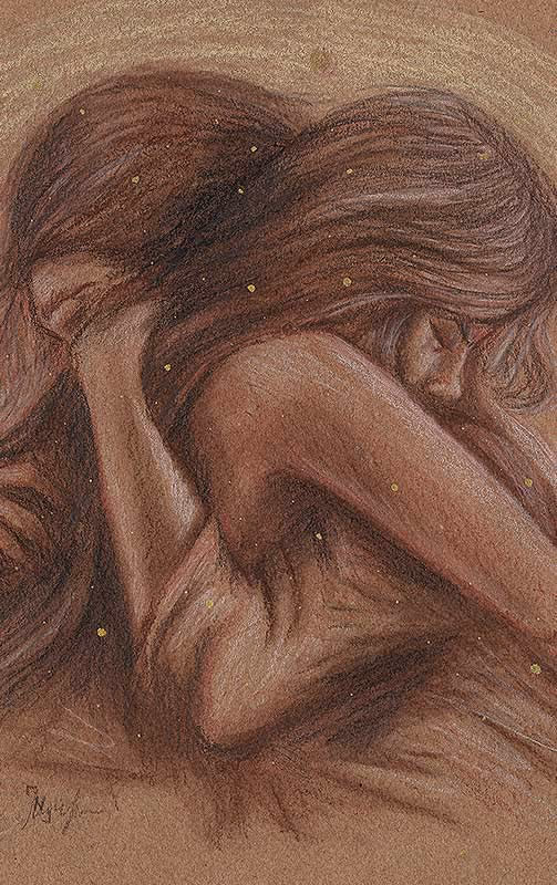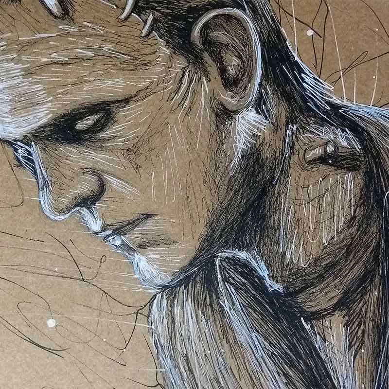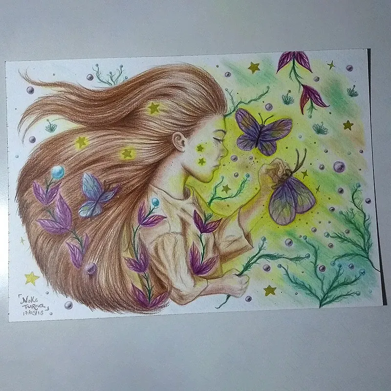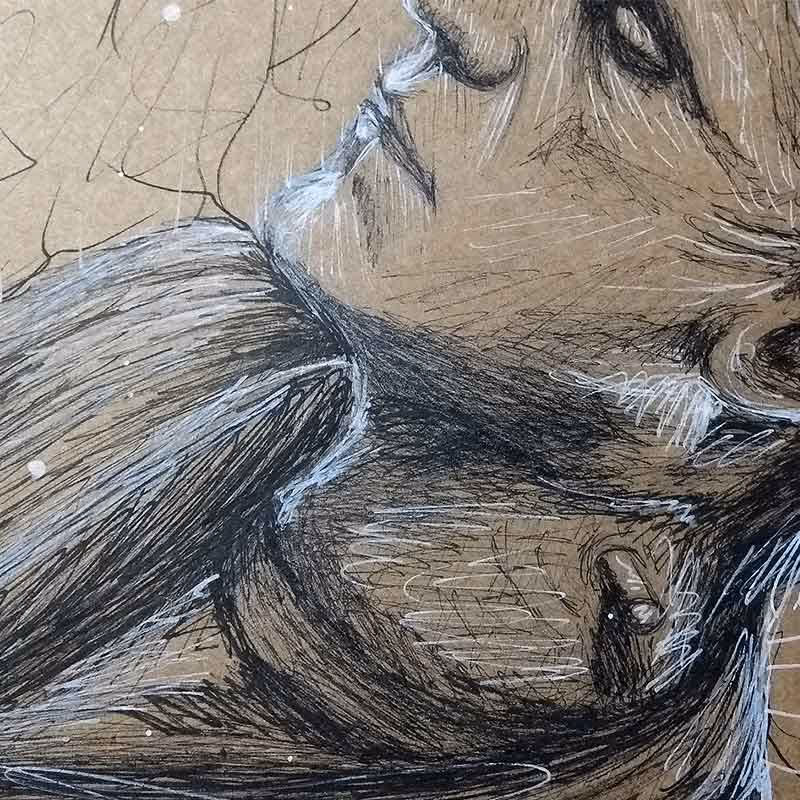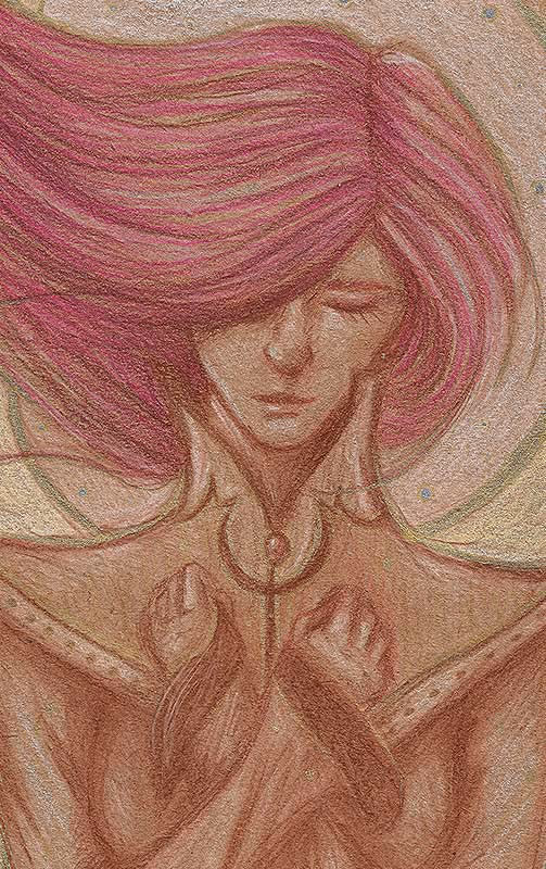 Desenho feito em lápis pastel Faber-Castell Polychromos (e alguns detalhes em caneta nanquim UniPosca dourada) sobre papel Canson A4 de 300g/m².