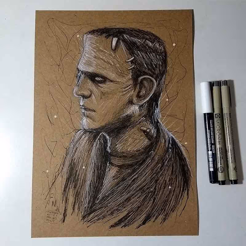 Frankenstein para o dia 30 do Inktober 2018: Jolt. Feito em canetas nanquim da Pigma Micron e UniPosca sobre papel Kraft A4 de 200g/m².
