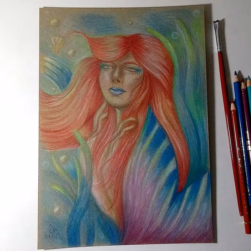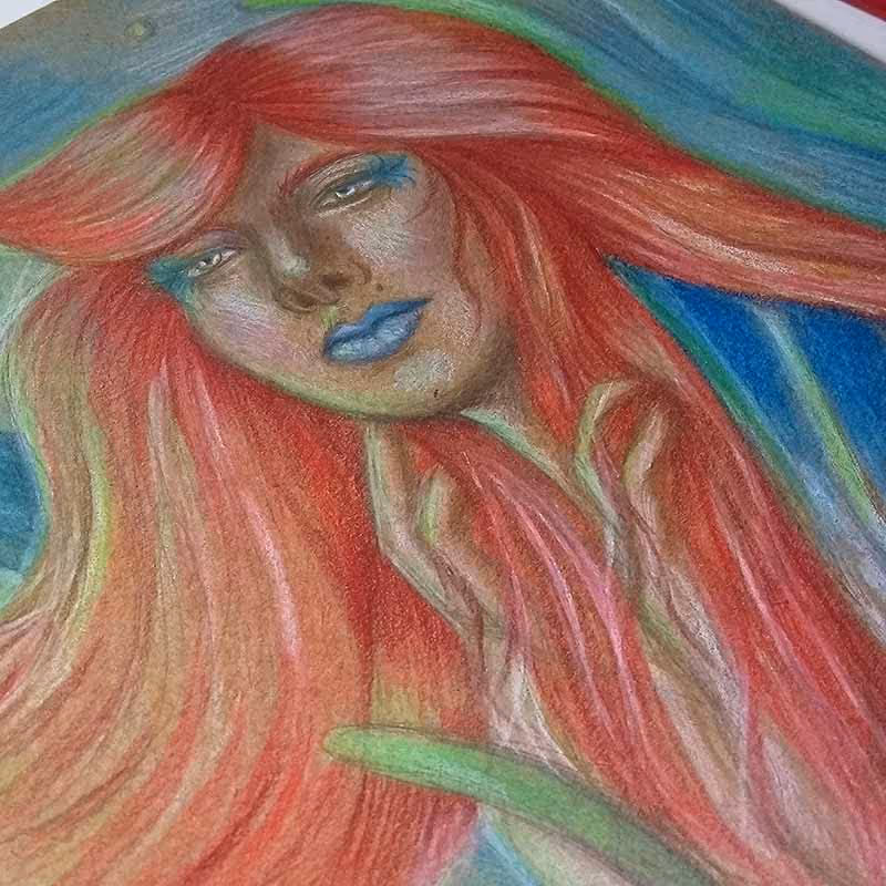 Desenho de uma sereia no mar feito em lápis pastel (Polychromos) sobre papel Kraft A4 de 200g/m².