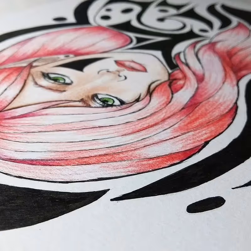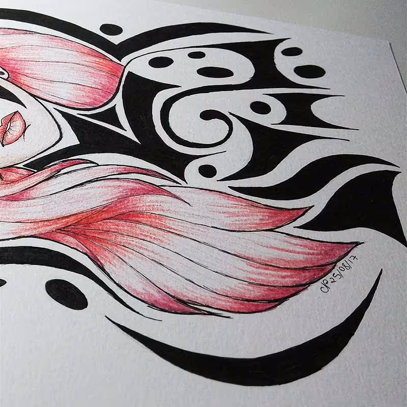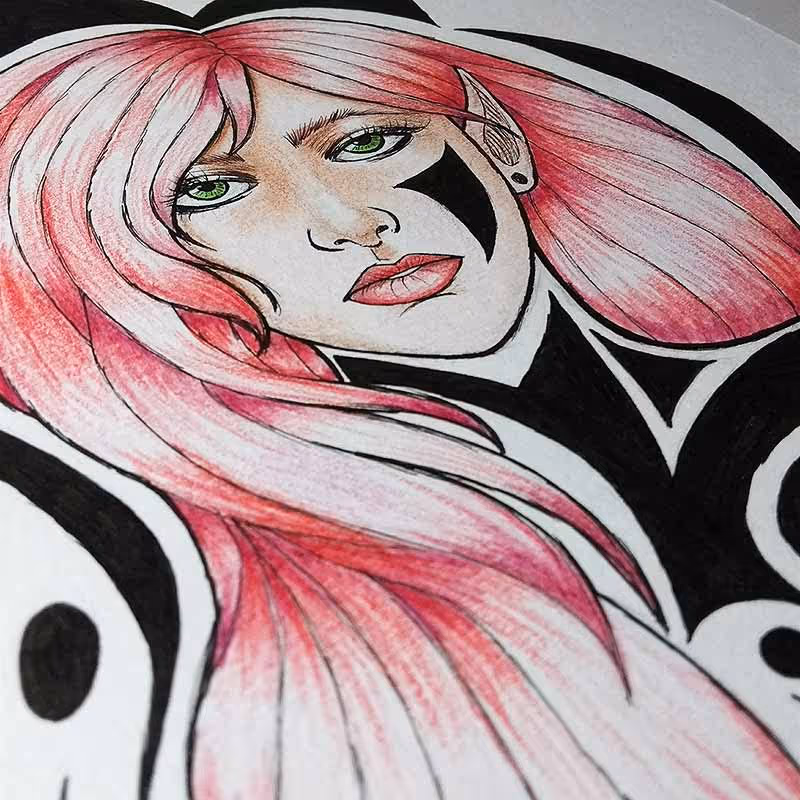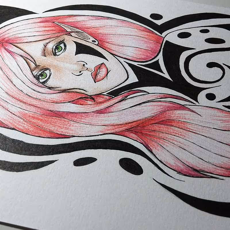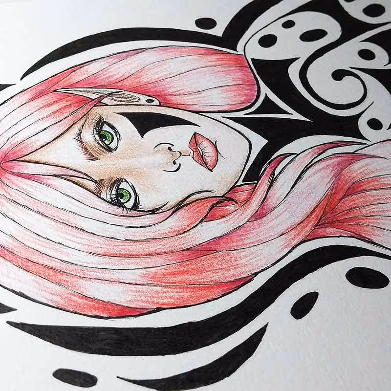 Desenho em caneta nanquim da Pigma Micron e lápis de cor comum sobre papel Canson A4 de 300g/m².