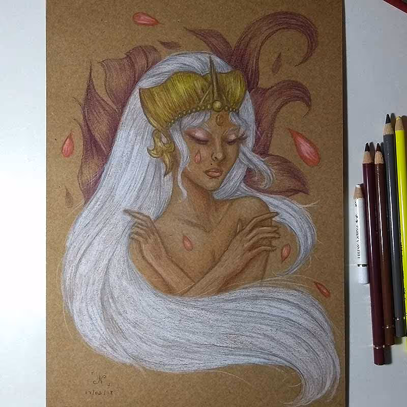 Desenho feito em lápis pastel Faber-Castell Polychromos (e alguns detalhes em caneta nanquim UniPosca dourada) sobre papel Canson A4 de 300g/m².